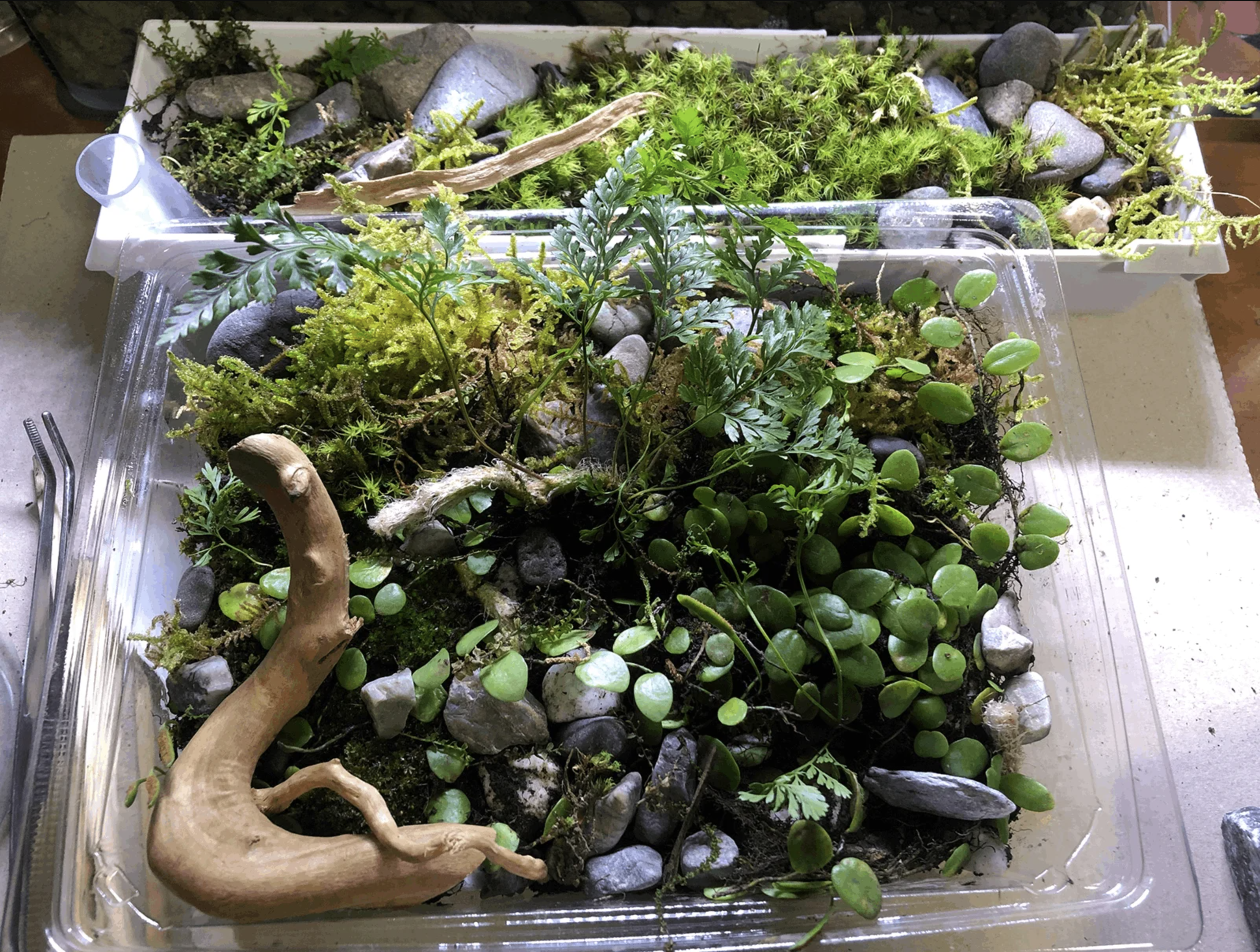 ↑今回の場合、コケ育成ケースを2つ作ることになりました。余った造形君や使わなかった石などは、このコケ育成に使うこともできるのでとても便利。小さなビンなどにコケをレイアウトする(本来の意味でのコケリウム)のも楽しいのでおすすめです。