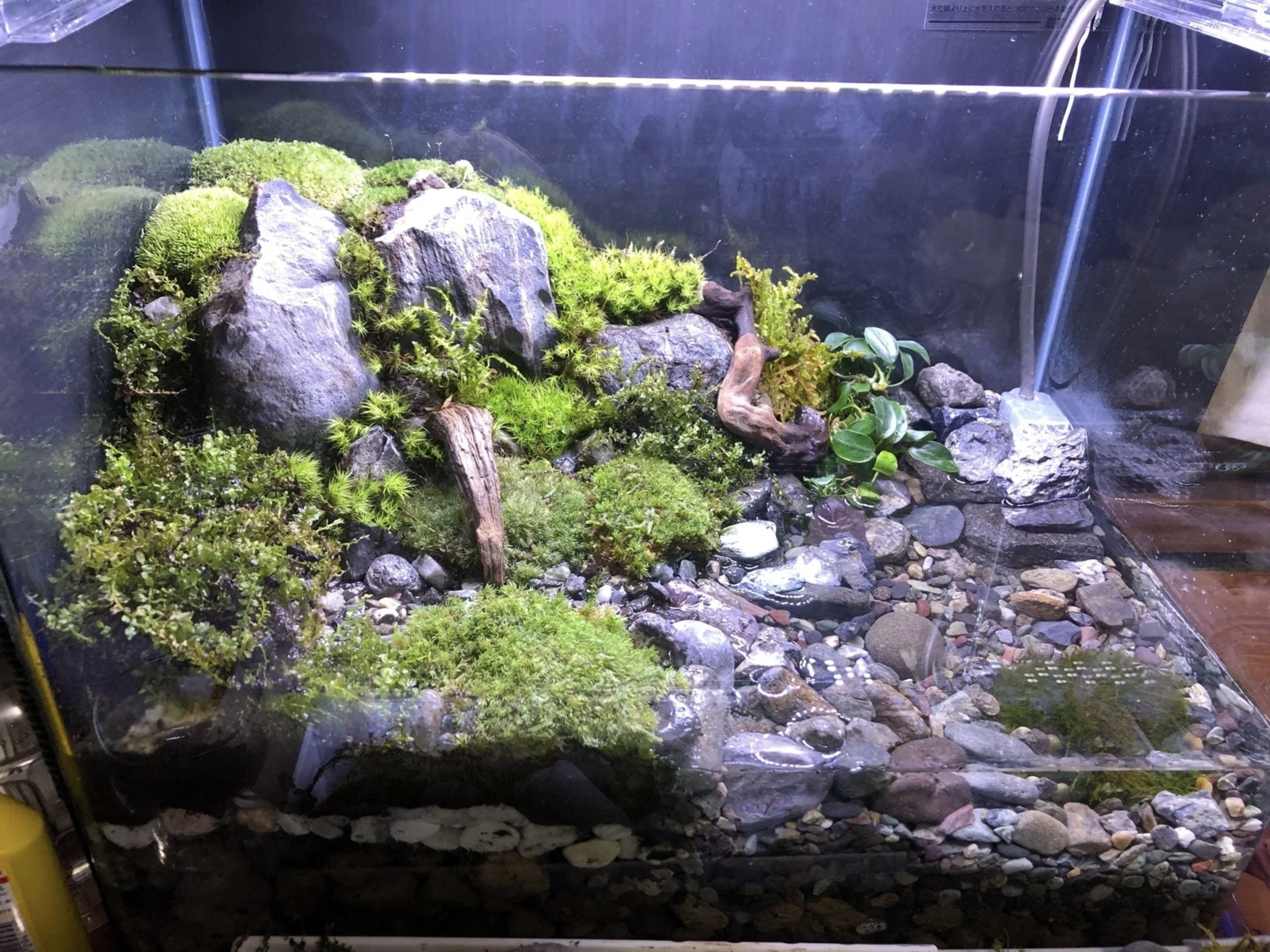 こういうアクアテラリウムを作るのは今回が完全に初めてなので、自分なりに勉強や研究をし尽くしましたがようやくここまで水槽の起ち上げまで到達しました。