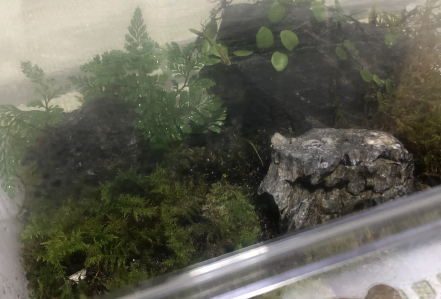 これはおそらく水辺があることで水自体は十分保たれていることと水槽自体のガラスブタと照明を遮るために使っている鉢底ネット(の複数枚重ね)が湿気が逃げるのを防いでいるんだと思います。あと、ガラスの壁面があることも風通しを防ぐという意味で有効なのかもしれません。