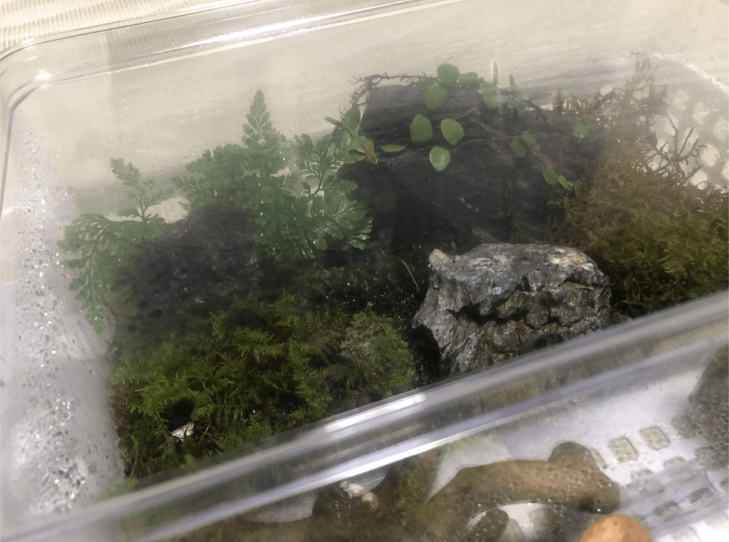 とはいえ、水槽内の場所によっては乾燥しやすいところもあるようでそこには他よりも重点的に水やりをすることで対処しています。