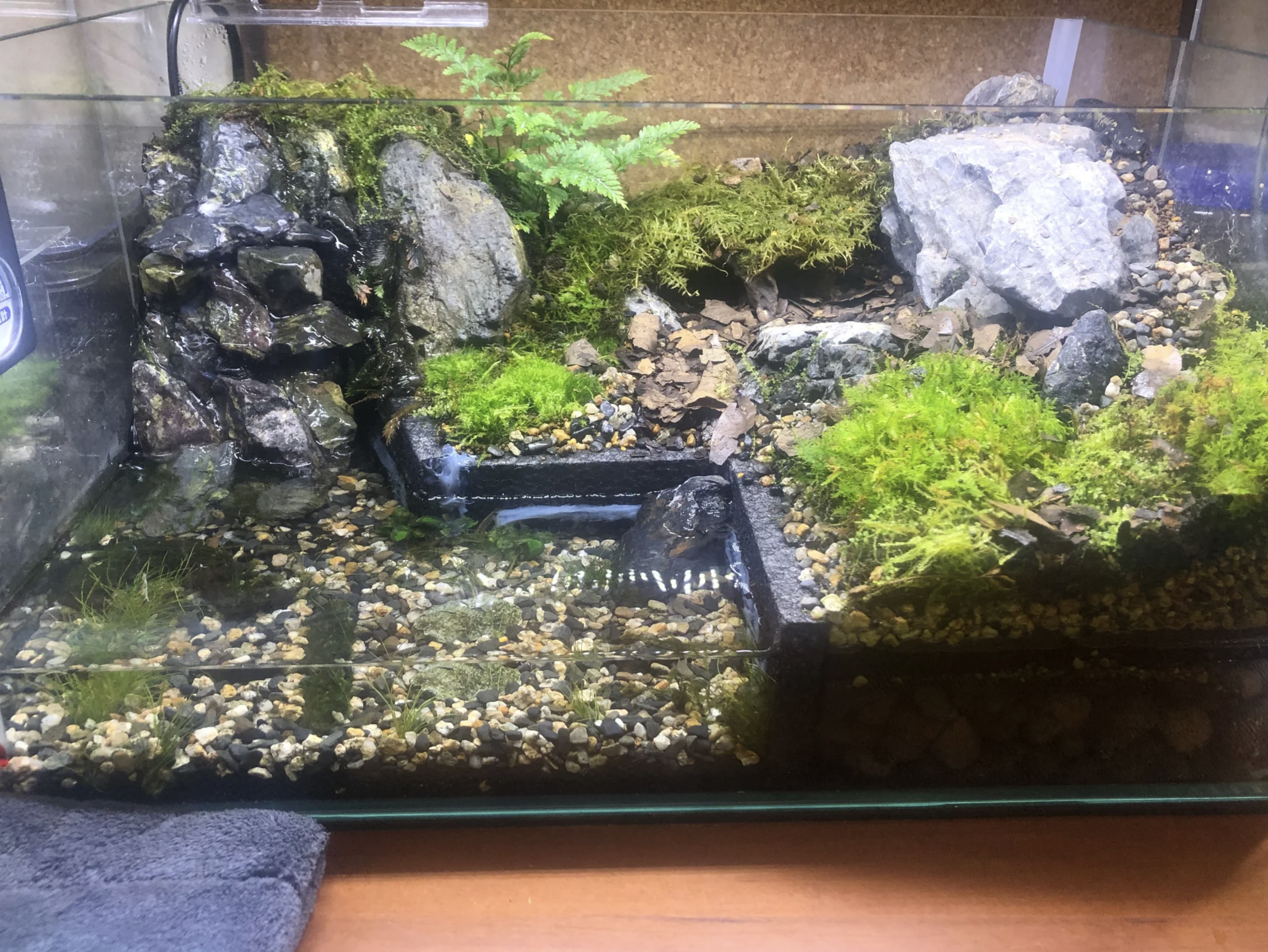 元々陸棲傾向が強いオキナワシリケンイモリなのでしっかり水辺を作る必要はないのですが、そこはアクアリウム初心者の私、「陸地も水辺も両方レイアウトされた水槽を作るんだ!」という素人にはかなり成功率の低い理想に支配されています。