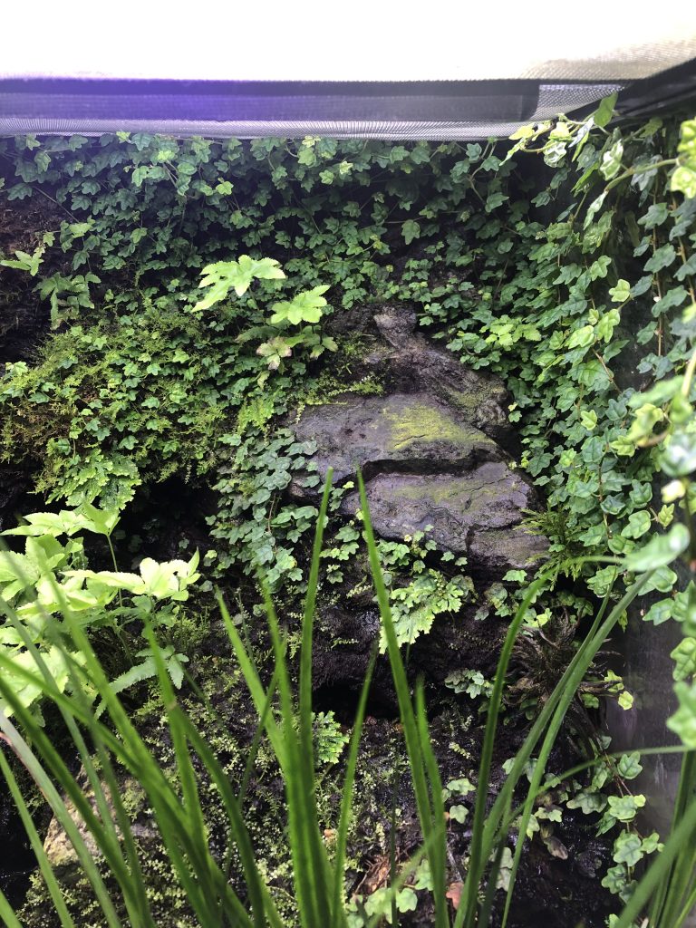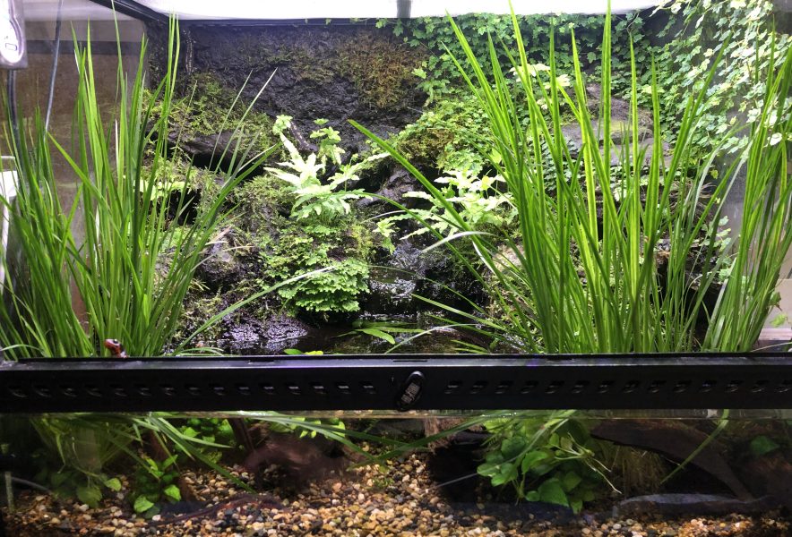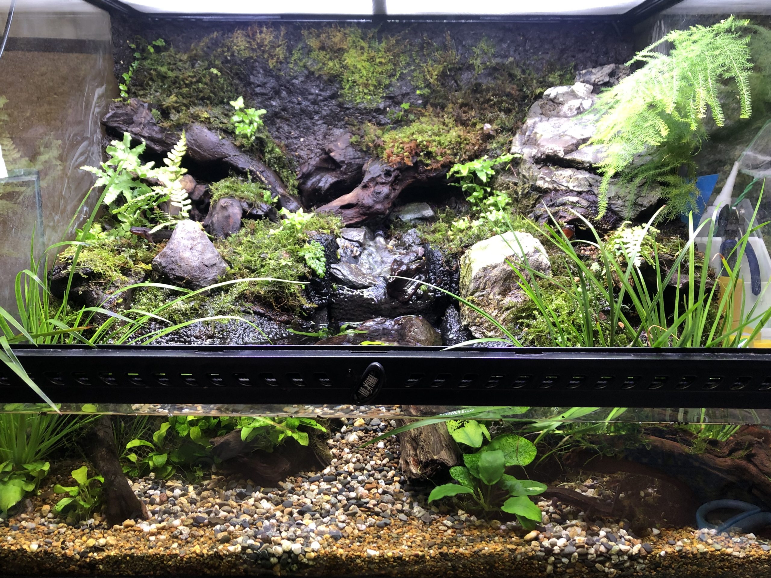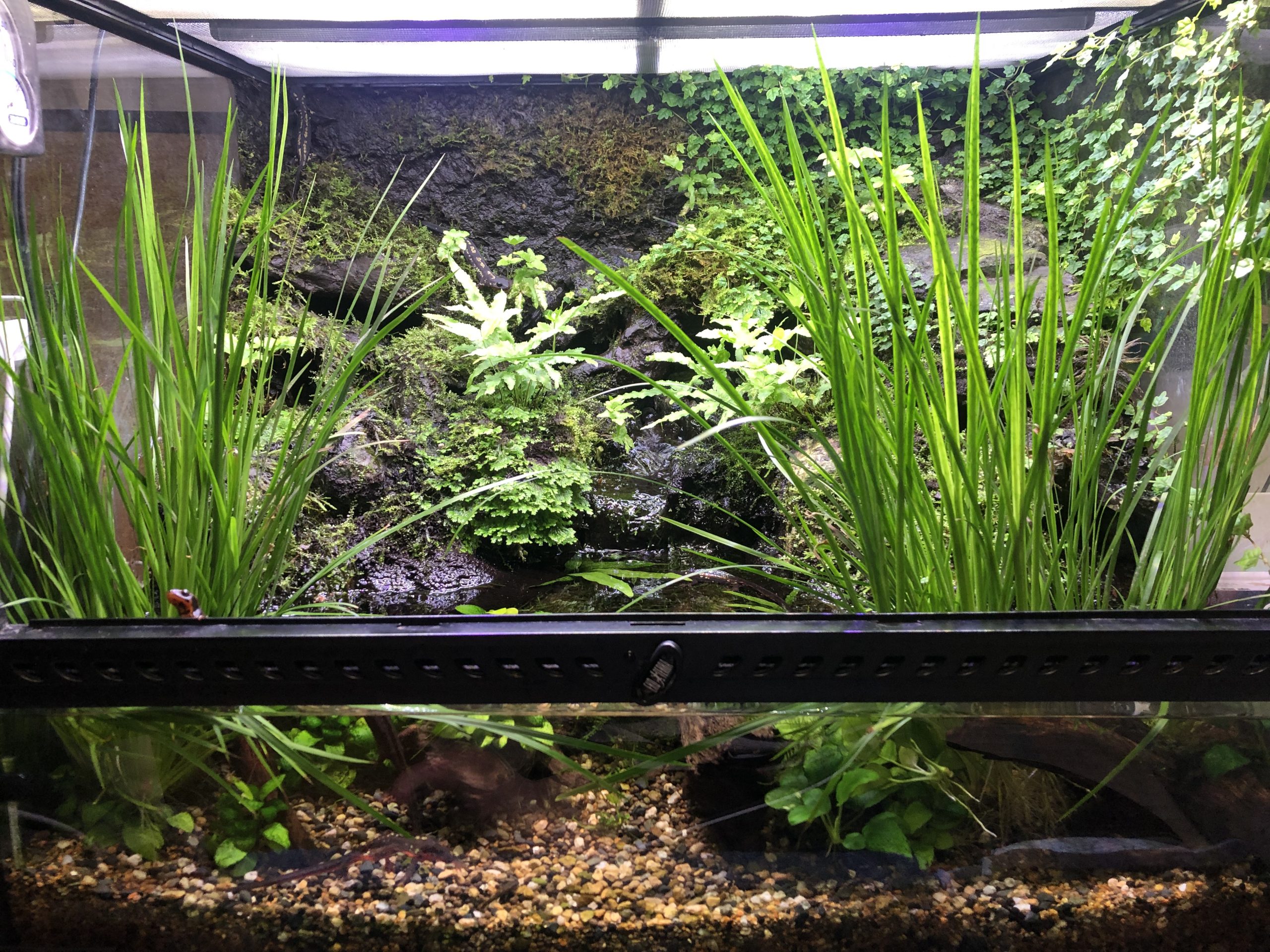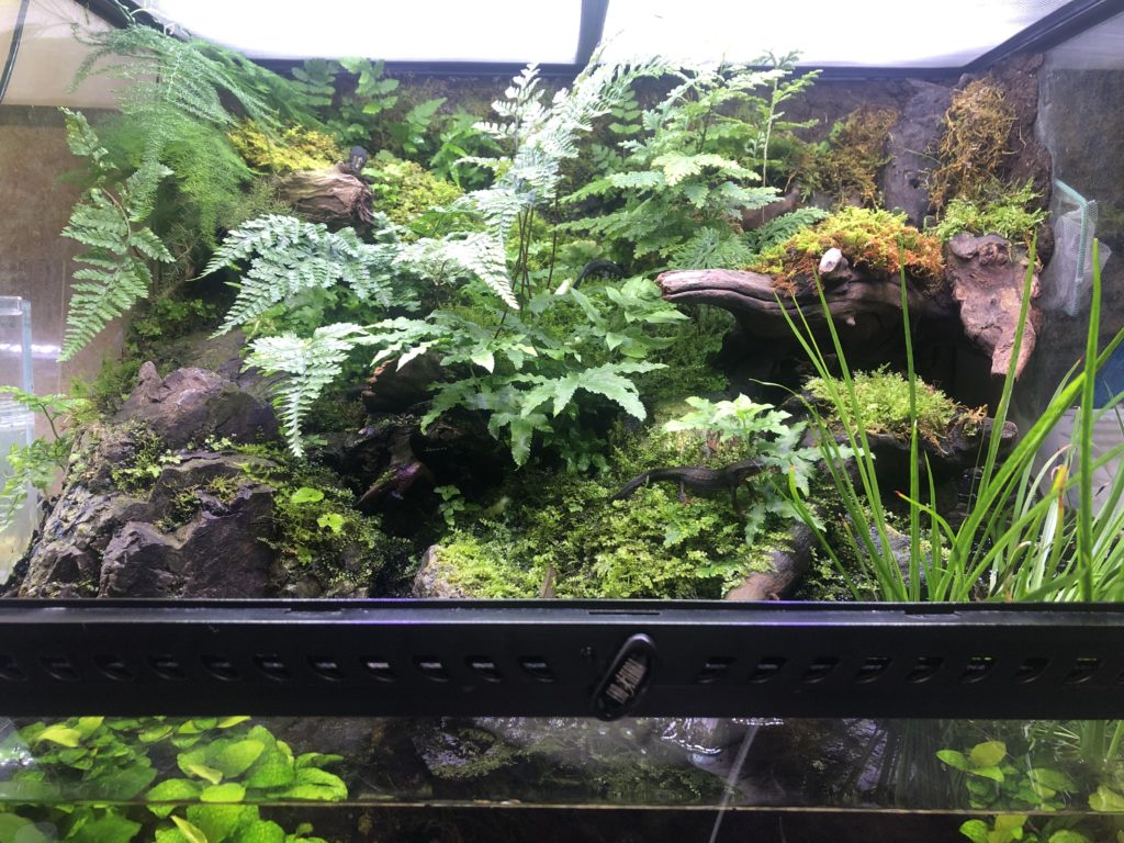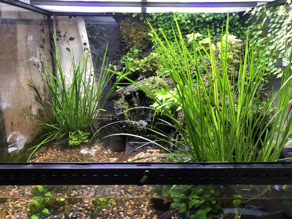 そして今回の六代目水槽の起ち上げでの最大の実験(と反省)は「有茎草をやめてみる」です。イモリウム水槽の多くがアクアテラリウムというスタイルでレイアウトをすることが多いと思うのですが、その中の主に「テラ側」(≒水上側)のレイアウトに欠かせないのが陸上の観葉植物です。